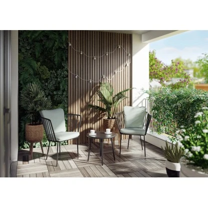 Dieses Balkonset eignet sich für den Balkon, Garten und die Terrasse. Für seine Fertigung wird robuster und langlebiger Stahl verwendet. Im Set enthalten sind zwei Stühle mit den Maßen 73 cm x 65,5 cm x 66,5 cm (H x B x T) und ein Tisch mit einer Höhe von 45,5 cm und einem Ø von 52,5 cm. Geliefert wird das Balkonset zudem mit Auflagen aus Polyspun, womit es einen angenehmen Komfort bietet.